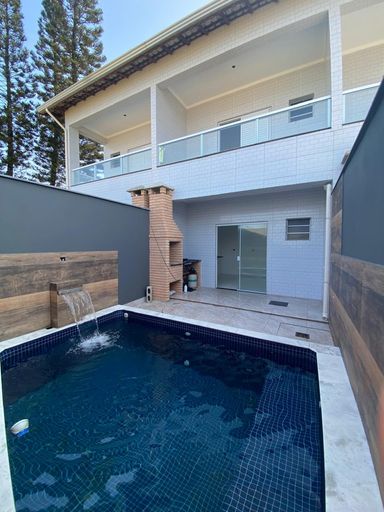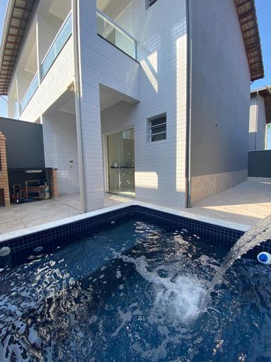 Sobrado em condomínio com duas suítes, piscina com cascata, churrasqueira, sala e cozinha em conceito aberto, lavabo, área de serviço, uma vaga de garagem. - Sistema de câmeras, alarme e cerca elétrica - Portão automático - Piscinas privativas e individuais em cada casa - Lindos e finos acabamentos de alto padrão - Pisos em porcelanato - Pedras em mármore e granito - Iluminação em LED Possui ótima localização, rua asfaltada e próximo da praia. Acabamentos exclusivos e da melhor qualidade! Realize o sonho de comprar esse lindo imóvel, através de financiamento bancário e FGTS! Cuidamos de toda burocracia para aprovação do seu crédito. Aceita financiamento direto com a construtora! Solicite uma simulação.